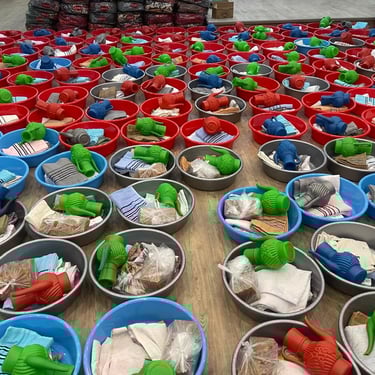 Kit Assembly & Labeling: Assembled hygiene kits and packaged blankets with partner branding.